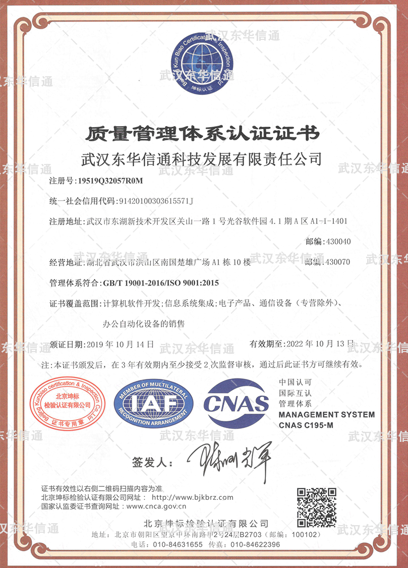 我司于2019年10月14日顺利通过管理体系(GB/T 19001-2016/ISO 9001:2015)认证,并获得《质量管理体系认证证书》。