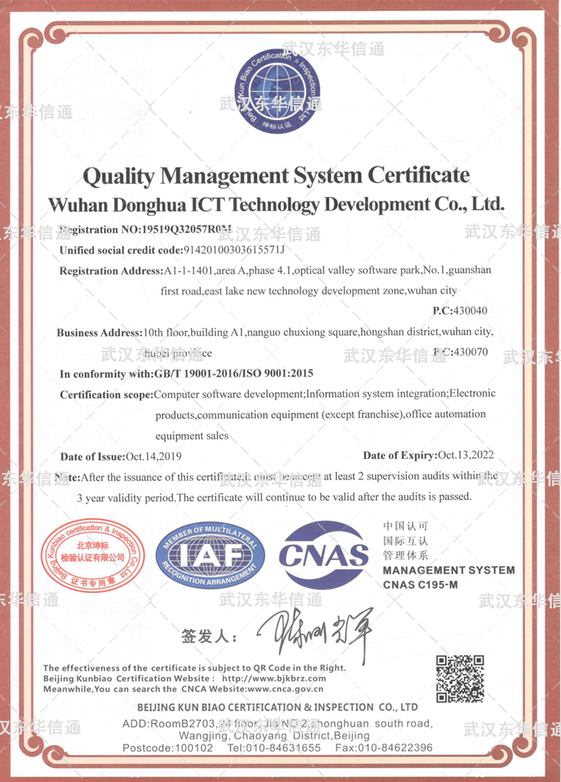我司于2019年10月14日顺利通过管理体系(GB/T 19001-2016/ISO 9001:2015)认证,并获得《质量管理体系认证证书》。