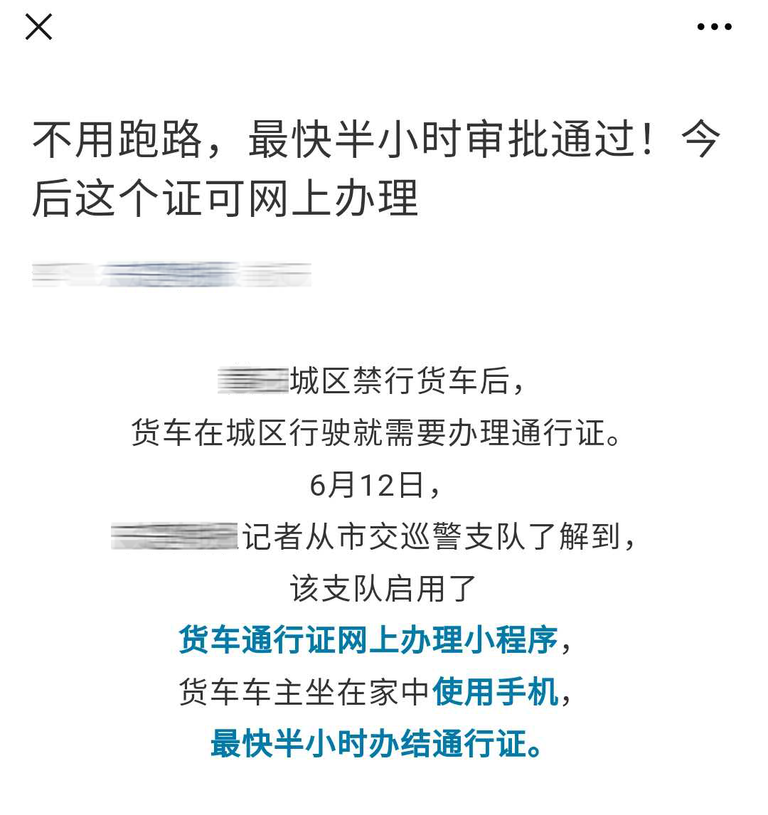 单位和个人的货车通过小程序申请通行证,只需提供申请理由、行驶证、交强险、车身照片、营业执照或道路运输许可证、送货合同、临检表等资料即可,审理流程简单、快捷,不用跑路,最快半小时可审批通过!为广大货车车主的合法出行提供了便捷通道!