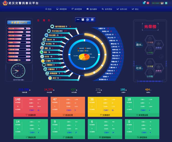 为了打破部门壁垒,整合信息资源将各类信息(来自上级、媒体、群众通过市长专线、微信、微博等各渠道)进行集中收集、转办、督办、反馈、分析,东华信通特提出了建设武汉交警社情民意云平台的建设任务。本平台功能强大,集美观、实用于一身。